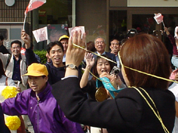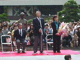 閉会セレモニー AM10:40〜 (市役所) ここである豊田市議を発見。(秘密) 「豊田スタジアムのこけら落としの時に柔ちゃん 来てもらったら五千人は集まるぞー」だって ダメよ私の前で変な事言っちゃあ・・・ |