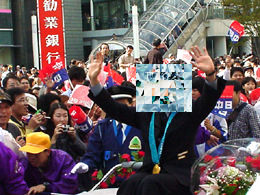 | パレード AM10:20〜 豊田市駅〜三重銀〜三宅歯科 〜GAZA〜十六銀〜市役所 そうだ、所属の柔道連盟にもトヨタ自動車にも 了承を得ていなかったなぁ。と言うことでモザイク 名前も伏せておこう・・・ |